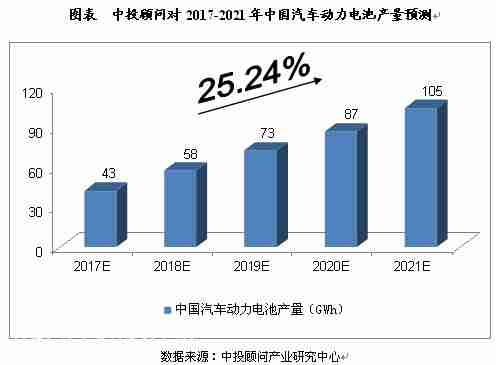 綜合以上因素,我們預(yù)計,2017年我國汽車動力電池產(chǎn)量將達(dá)到43GWh,未來五年(2017-2021)年均復(fù)合增長率約為25.24%,2021年將達(dá)到105GWh。